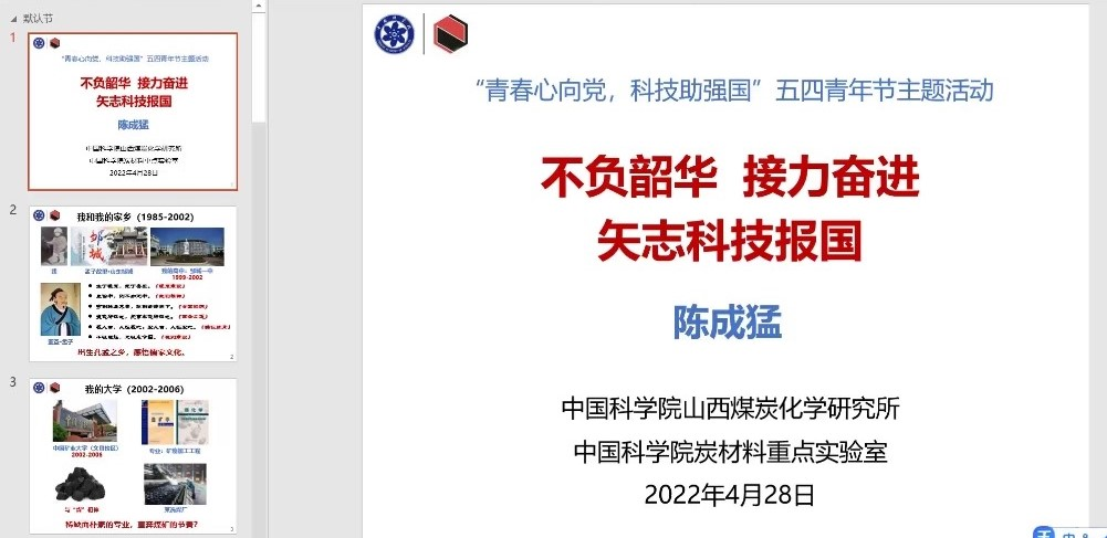 为迎接党的二十大胜利召开,纪念共青团成立100周年,2022428日上午,分省委团工委举办了 “喜迎二十大、奋进新征程”主题活动,活动的内容是弘扬科学家精神主题报告。会议通过线上形式开展,研究生党支部全体党员参加了会议。