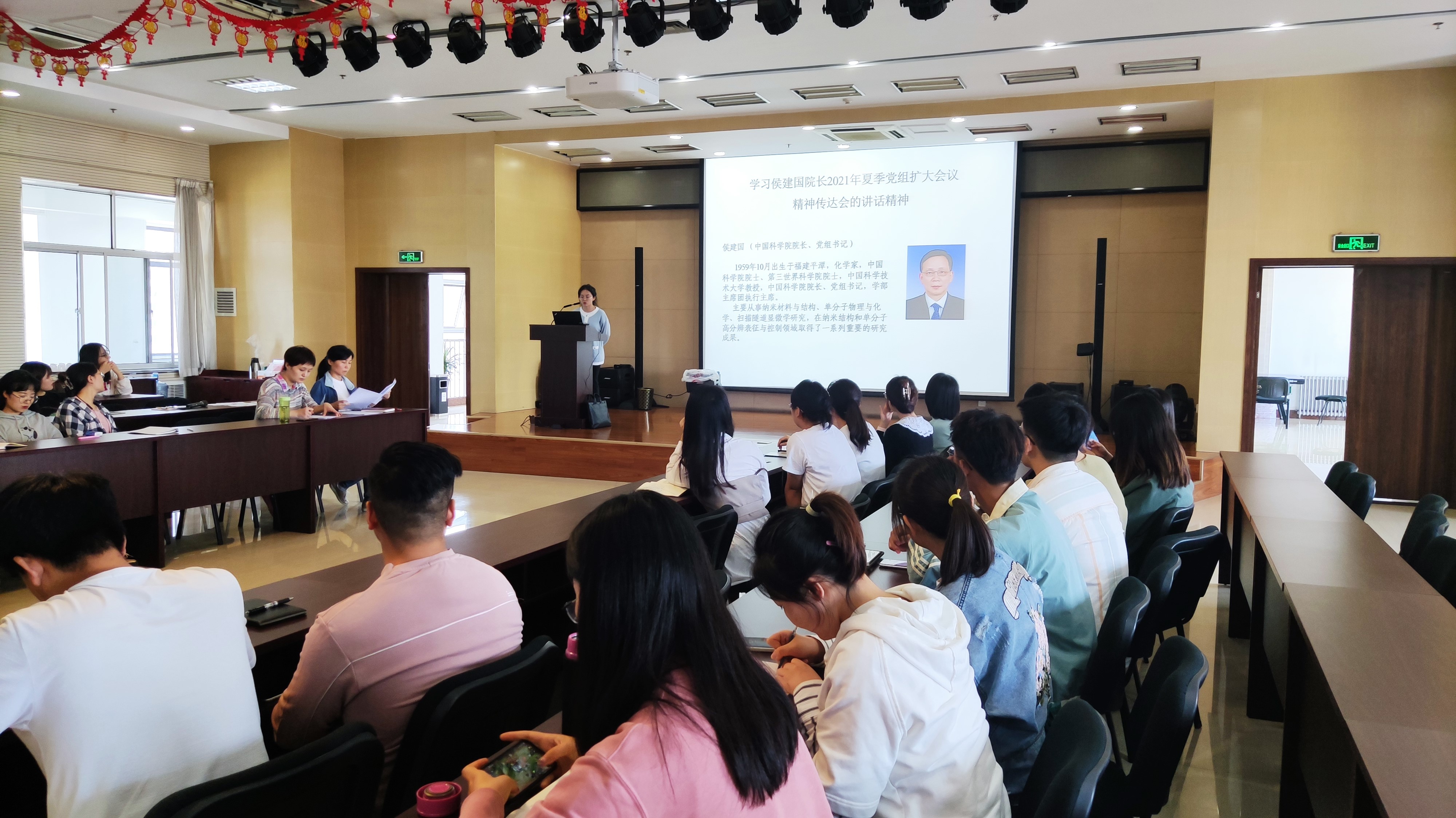 随后,会议对侯建国院长2021年夏季党组扩大会议精神传达会的讲话精神进行学习。通过“国家事、国家责、国家队、国家人”等关键词,全体党员集体学习了“深入学习贯彻习近平总书记重要讲话精神,进一步把思想和行动统一到党中央、国务院重大决策部署上来”、“准确把握‘国家事’‘国家责’的内涵和要求,进一步明确新时期的使命定位和目标任务”、“强化责任担当和使命驱动,统筹推进研究所改革创新发展”、“加强党的全面领导和党的建设,为‘四个率先’和‘两加快一努力’提供坚强政治保证”等重要精神。通过集中学习,大家对“心系国家事”、“肩抗国家责”的使命担当有了更深入的认识和理解。