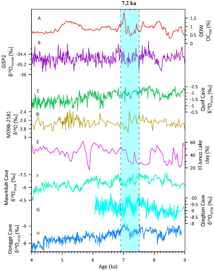 近日,中国科学院地球环境研究所黄土与气候变化团队,孙有斌研究员、刘星星副研究员联合中国科学院西北生态环境资源研究院、兰州大学、西北大学等,通过黄土高原西部高沉积速率的大地湾剖面,在AMS14C定年基础之上,采用有机碳(OC400)、总氮(TN)等多指标重建了1.4万年以来该地区的气候变化历史。研究结果表明,大地湾剖面有机碳和总氮在7.2 ka显著下降,表明此时植被生产力显著降低,东亚夏季风减弱。通过与全球高分辨率冰芯、湖泊、海洋和石笋δ18O等记录对比发现,7.2ka冷事件可能是一次全球性变冷事件(图1)。这次冷事件与北大西洋淡水强迫叠加太阳辐照度下降有关。