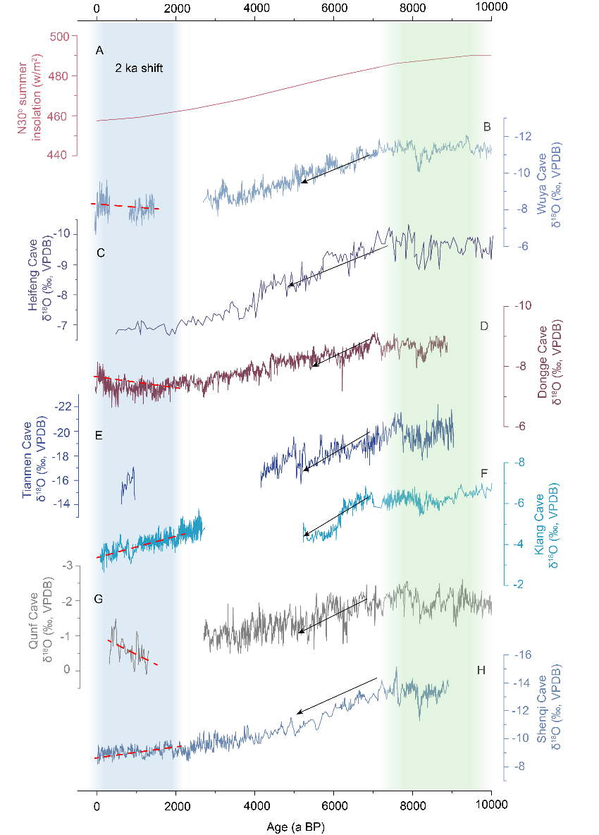 神奇洞石笋δ18O 结果表明,ISMBOB在过去9000年整体呈现逐渐减弱的趋势(图1),这与亚洲季风区的 ISMAS和 EASM 记录一致,主要受北半球夏季辐射(NHSI)变化控制。然而过去2000年神奇洞 δ18O 记录的ISMBOB呈现出长期减弱的趋势,与ISMAS和东亚夏季风(EASM)的增强趋势相反,可能反映了季风系统对"2-ka shift"的复杂响应。印度季风孟加拉湾支在 9.0 - 7.5 ka BP 期间最强,在 7.2 - 5.0 ka BP 之间快速减弱。