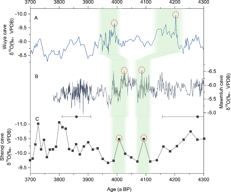 图3 神奇洞 δ18O与乌鸦洞、Mawmluh洞δ18O 4.2 ka事件对比