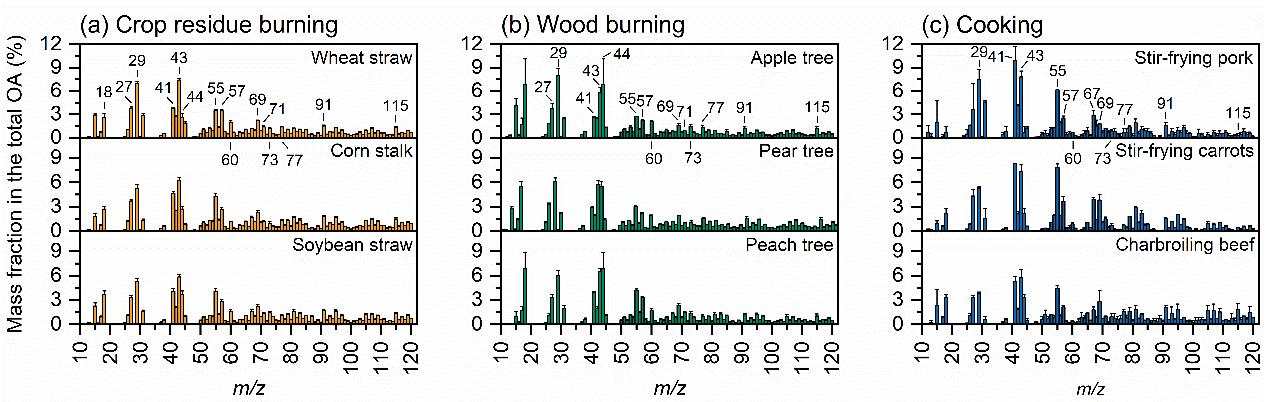 图1.(a)农作物秸秆燃烧、(b)薪柴燃烧和(c)烹饪源排放有机气溶胶的质谱特征。