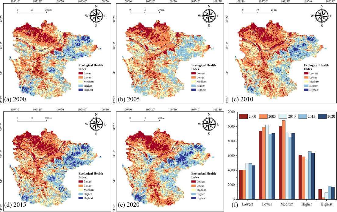 图2 秦岭-关中平原过渡区蓝田县2000-2020生态系统健康指数空间分布图