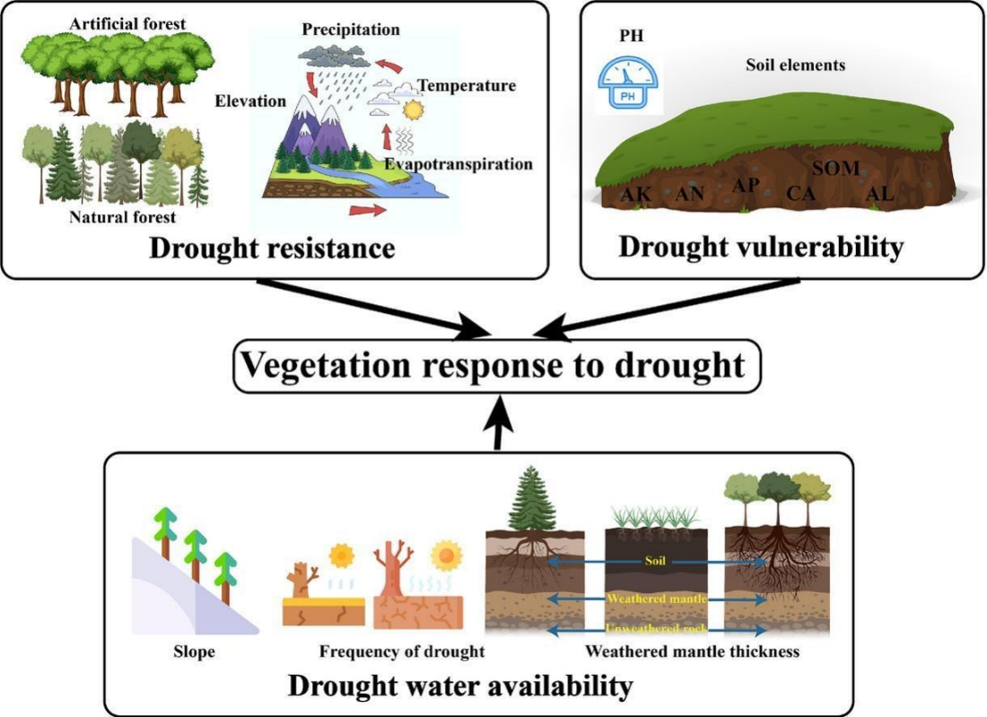 基于这一科学问题和国家需求,地球环境所金钊研究员与长安大学彭建兵院士团队合作,依托国家自然科学基金委专项项目《秦岭生态地质环境系统演化与灾害风险管控》,综合运用多源数据与多种生态—地球系统模型,阐明了秦岭地质环境、生态环境与人类活动之间的耦合互馈机制及作用过程,揭示了气候、地质与人类活动要素对秦岭-关中平原过渡区生态系统健康的影响途径,并进一步揭示了地形、土壤与人类活动要素如何共同调控植被对气候干旱的响应规律,取得了以下系列进展: