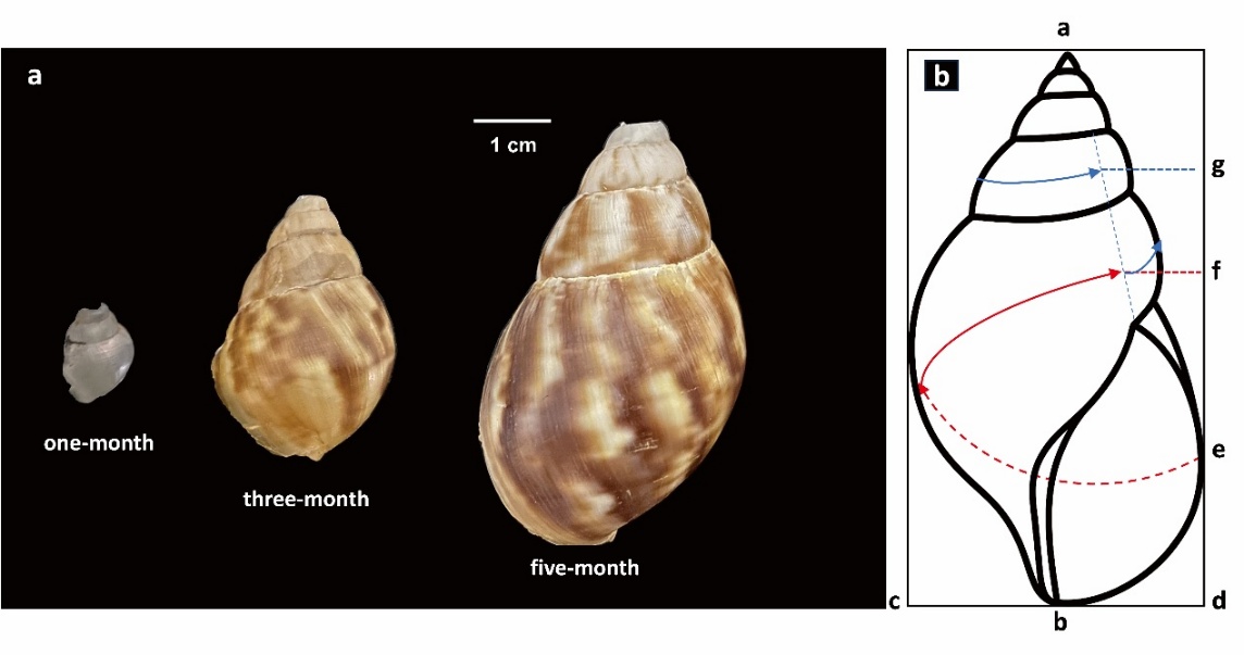 图1. (A)实验室培养的不同生长阶段的非洲大蜗牛(Achatina fulica); (B) 蜗牛壳体形态参数测量示意图。