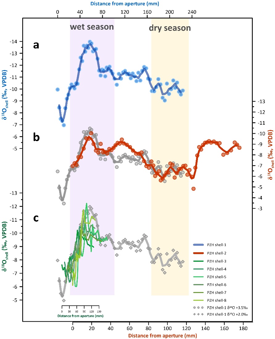 图4. 不同年龄的非洲大蜗牛(Lissachatina fulica)高分辨率δ18O序列(野外样品采自四川攀枝花)。