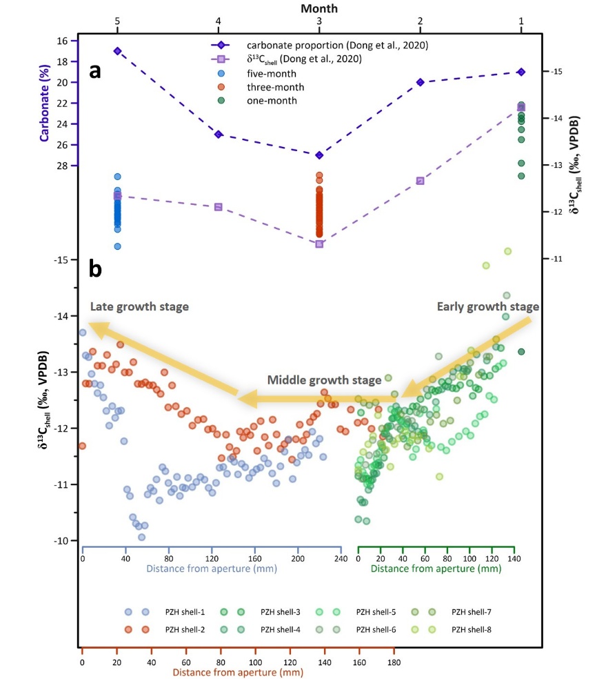 针对这一科学问题,中国科学院地球环境研究所“气候变化集成-模拟-同化-预测(CLIMAP)”团队,基于实验室培养的非洲大蜗牛(Achatina fulica)与四川攀枝花地区的野生蜗牛样品(Lissachatina fulica),开展了壳内高分辨率稳定同位素(δ18O和δ13C)分析,系统探讨了壳体氧、碳同位素在蜗牛个体发育过程中的主要控制因素。