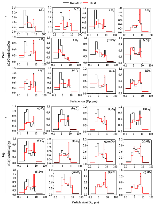 图4 沙尘期与非沙尘期华山山脚和山顶二元羧酸的粒径分布对比