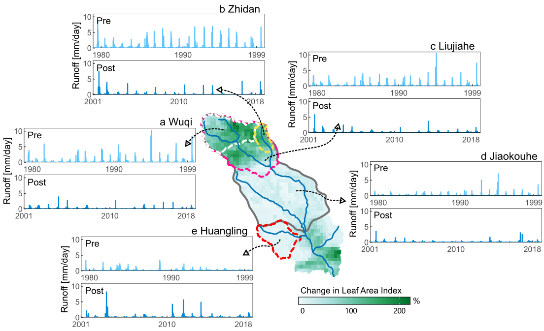 大规模植被恢复工程在全球范围内广泛实施,我国“退耕还林(草)”工程是最具代表性的实践之一。已有研究表明,植树造林往往通过增强蒸散发而降低流域的年径流总量。然而,植被恢复如何影响事件尺度上降水向径流的转化过程,尤其是在大流域和极端降水事件条件下,仍缺乏统一认识。