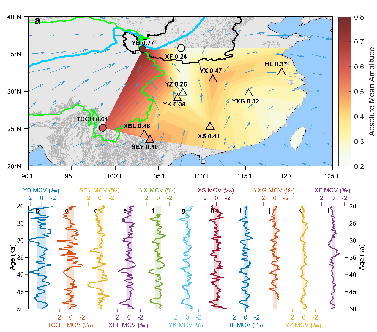 图3 末次冰期中亚洲季风降水同位素千年尺度平均振幅的空间差异