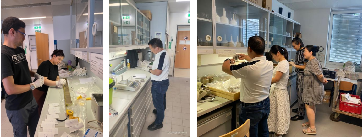 除野外考察外,团队与维也纳大学科研人员展开深度协作,成功获取哈尔施塔特湖沉积物和黄海沉积物两个高分辨率沉积物柱样品,并在维也纳大学实验室高效完成样品分样、前处理等关键环节,为后续实验室分析奠定了坚实基础(图2)。访问期间,团队还参观了维也纳大学地质博物馆,系统了解了该校在人类世研究领域的历史积淀与前沿成果,进一步深化了双方的学术互信。