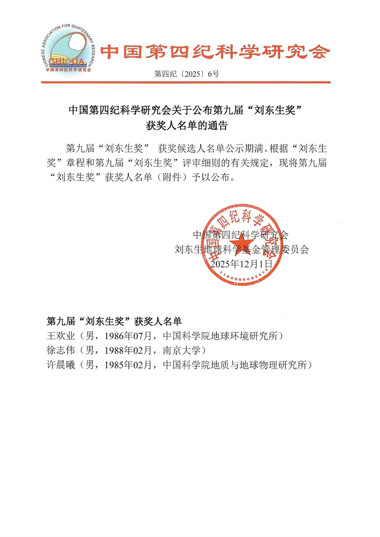 12月1日,中国第四纪科学研究会、刘东生地球科学基金管理委员会公布了“刘东生奖获奖人名单”。地球环境所王欢业研究员荣获第九届“刘东生奖”。