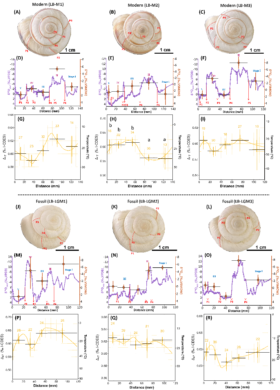 图3. 灵宝(LB)地区现代和化石蜗牛壳体内高分辨率氧同位素(δ18Oshell)和团簇同位素(Δ47)的变化特征,揭示了蜗牛生长过程中体液水氧同位素(δ18Obw)和生长温度(T47)的季节变化。x轴为蜗牛壳体从壳口(0 mm)至壳顶的距离。