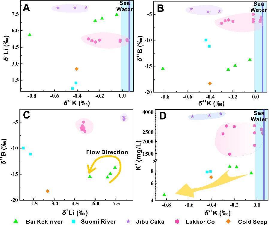 中国科学院地球环境研究所联合多家单位,将Li-B-K非传统稳定同位素应用于拉果措卤水矿床,对其战略资源的元素来源及地球化学行为进行了分析。在湖表卤水中,钾同位素组成呈现出与锂硼同位素不同的非均一特征,且呈现出双端元聚集,揭示了关键构造带盐湖与海水接近的钾同位素组成及其表生-深部耦合控制的元素来源(图2)。