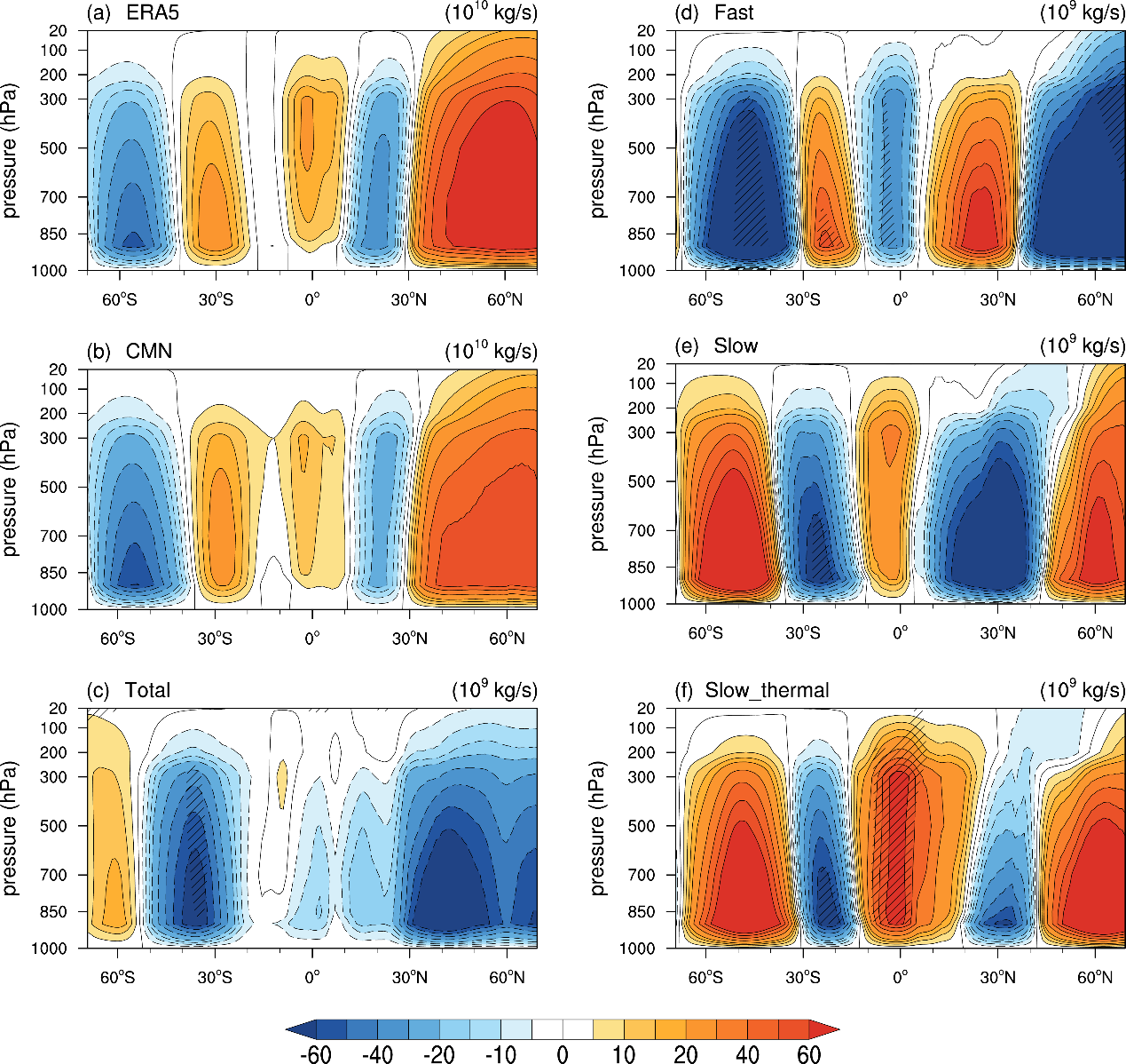 图2 南半球夏季纬向平均(140°E–180°E)经向环流质量流函数。